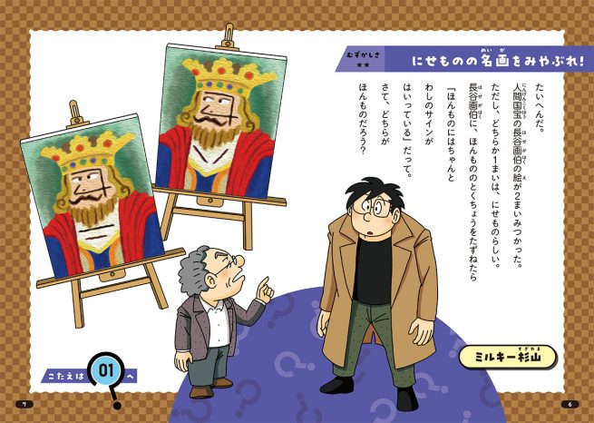 たいへんだ。人間国宝の長谷はせ画伯の絵が2まいみつかった。ただし、どちらか1まいは、にせものらしい。長谷画伯に、ほんもののとくちょうをたずねたら