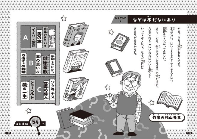シリーズを読み込んでいる方はもちろん、シリーズ未読の方も楽しめます。難しさは星1つから5つで、ランダムに掲載されています。じっくり見て考える問題、ひらめきが決め手になる問題、ひっかけ問題など、問題のタイプもさまざまなのもポイント。最後の問題には、作者の杉山さんも登場します!