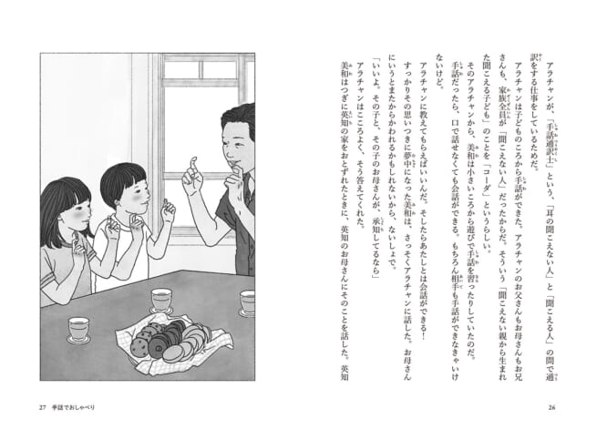 主人公の美和は、お母さんの再婚相手で、コーダ(ろう者の両親をもつ聴者)として育った義父から手話を習っています。その友だち、英知は場面緘黙症をもつ少年。二人は手話を使って心を通わせながら、身近で起こるふしぎな事件の謎に挑みます。