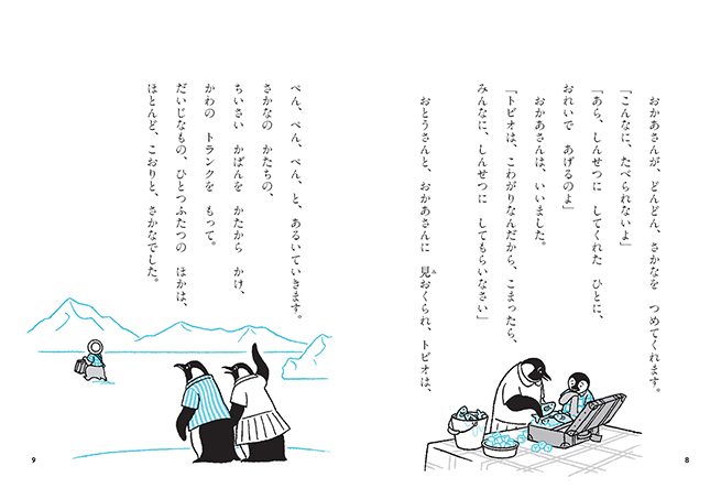 主人公はペンギンの子どもの、トビオ。2年前、とつぜん届いた、北極にすむシロクマのポーラさんからの「なんきょくのペンギンさま」宛の手紙にお返事をしたトビオは、幾度ものたのしいやりとりの末、この日、ついに飛行機に乗って文通相手のシロクマに会いに行くことになったのです。
