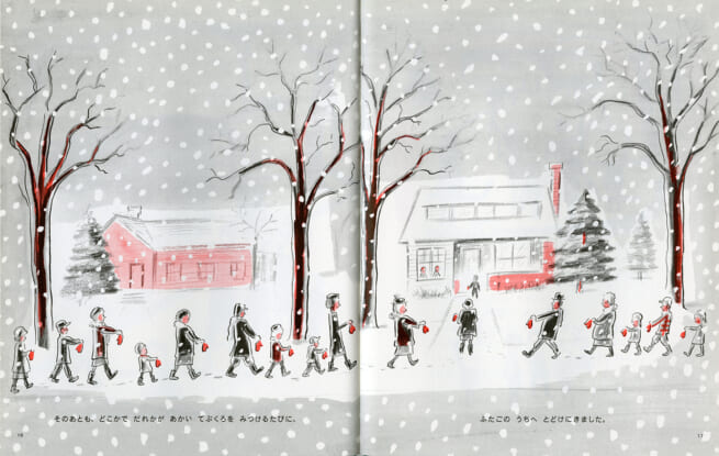 ほんとうの持ち主はきっと困っていることでしょう。そこでふたごは、たくさんの赤い手袋を無事に持ち主へ返すため、とってもいいことを思いつきます! 人々のやさしさに、心あたたまる一冊です。
