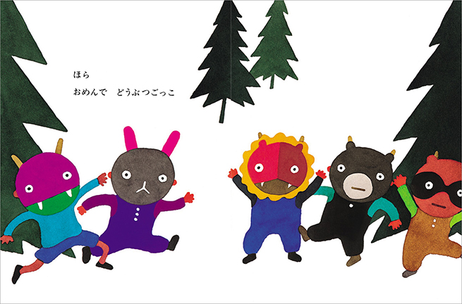 男の子が紙を切りぬいて、鬼のお面をつくりました。「ぼく おにだ!」「こわい おにだぞ!」と、出かけていくと、うさぎに出会います。と思ったら、それはうさぎのお面をつけた鬼でした! 男の子と鬼の子たちは、たのしく「おめんあそび」をしますが、やがて、男の子が鬼のお面をつけたり、鬼の子が人のお面をつけたりしはじめて……。