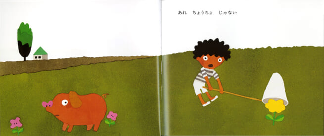 このあとも男の子は、黄色いちょうちょを見つけては、虫とり網を持って近づいていくのですが、ちょうちょだと思ったものは、ボールだったりひよこだったり、風船だったり。あまりにちょうちょが見つからないので、だんだん自信がなくなってきます。