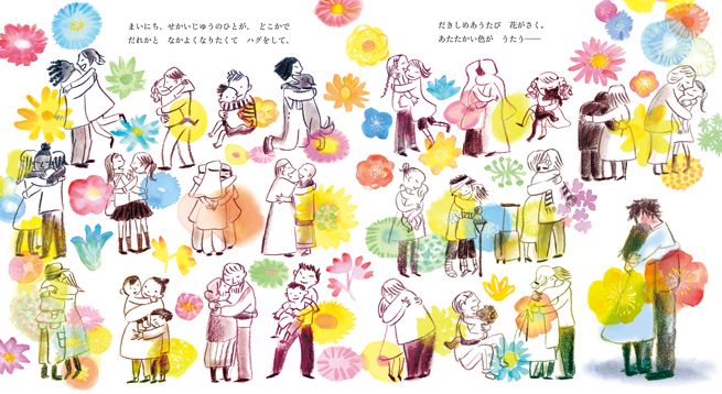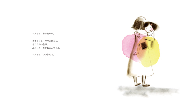 絵本の中では、セピア色の線で描かれた人たちがハグをすると、そこにふわっとあたたかい色があらわれます。うれしさや、ほっとする気持ちが伝わってくる素敵な表現だと思いました。