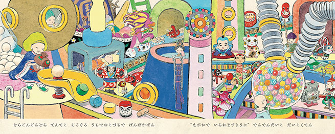 ありがとうございます。普段から色数が多く、わりとサイケデリックな色彩の絵を描くので、それを殺さないように気をつけました。今回初めて和紙に描いてみたのですが、日本らしさはありながら、和風になりすぎず、昔話風になりすぎないように、色彩や出てくるアイテムで、ポップでキッチュなムードをいかにキープするかに心を配りました。