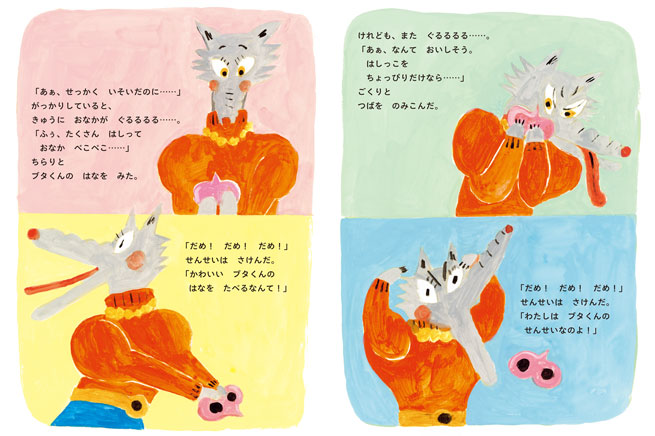 まず、色が素敵!と思いました。ブタくんが鼻だけになったシーンの背景のくすんだ緑色は、物語の展開のシュールさを際立たせ、オオカミ先生のセーターの赤色は、先生の内側に秘めた狂気を予感させるようでした。