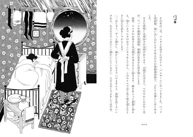 しかも息を潜めて暮らさなくてはなりません。なぜなら、マルタのお母さんがホテルの清掃作業員だから。一日じゅう小さなネズミのように静かにしているのよ。ロビーに行ってもいいけど、なにひとつさわらず、だれにも話しかけず、人の目につかないように注意しなさい。マルタは、お母さんにきつく言いつけられていました。
