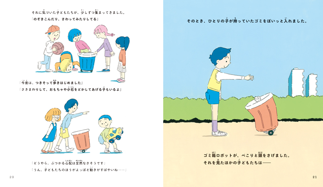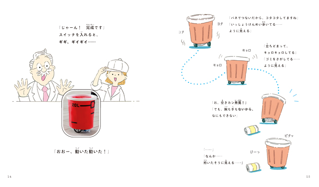 弱いロボットとして〈ゴミ箱ロボット〉が出てくる。センサーでゴミを発見して、アームで拾い集めるというような高機能なロボットではない。ローテクなシンプルなもので、よろよろと動いている。自分ではゴミを拾えないのだ。それを見かねた子どもたちが、代わりにゴミを拾ってくれる。そうすると、ペコリとおじぎをする。子どもたちは楽しくなって、さらにゴミを探して拾ってくれる。